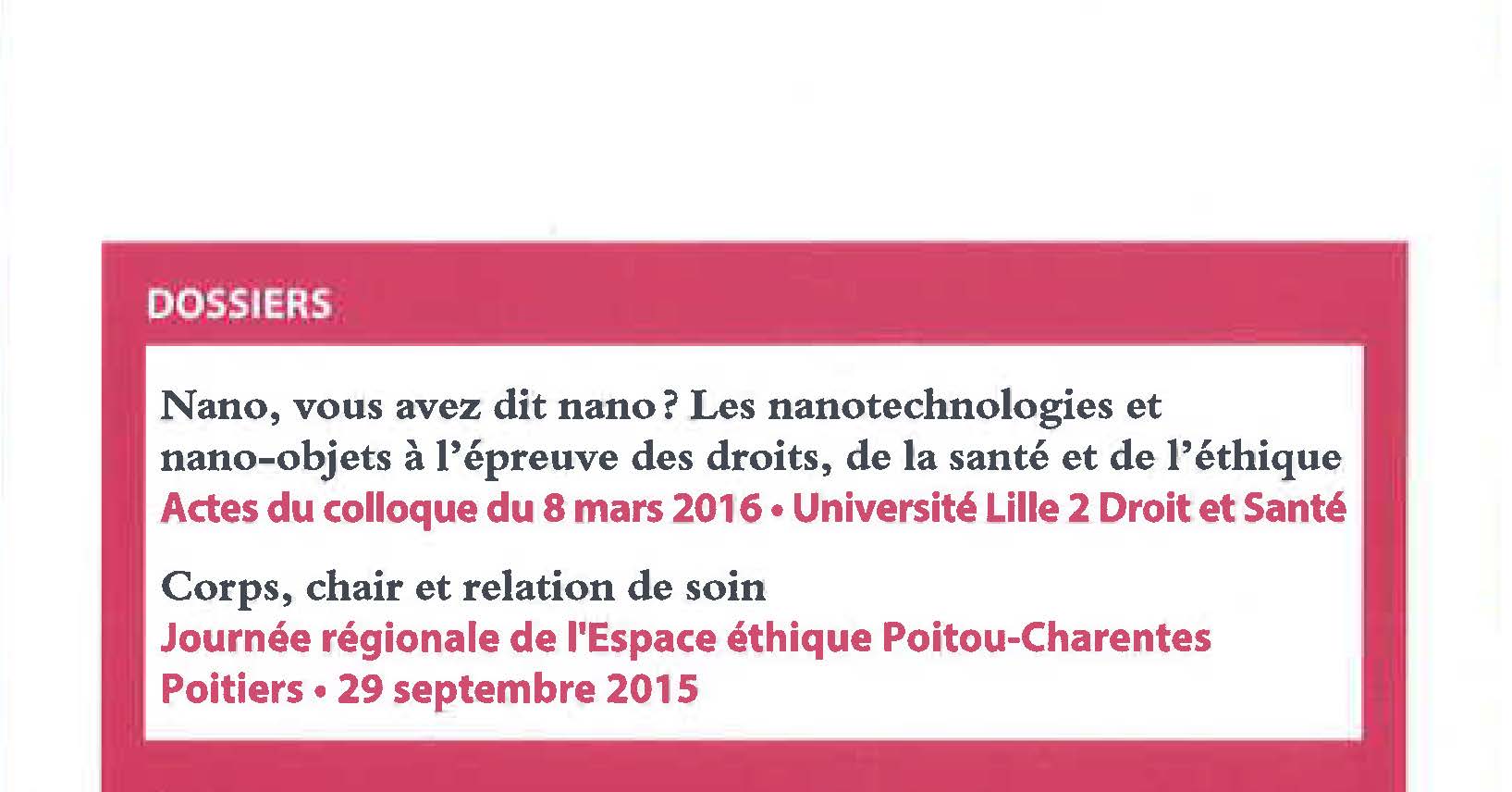 Les actes du colloque « Nano, vous avez dit nano ? Les nanotechnologies à l’épreuve des droits, de la santé et de l’éthique », organisé le 8 mars 2016 à la faculté des sciences juridiques, politiques et sociales de l’université Lille 2 Droit et Santé, sont parus aux éditions Les études hopitalières (LEH) dans le n°60 de la Revue générale de droit médical (septembre 2016).