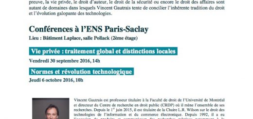 Vincent Gautrais, professeur à la faculté de droit de l’Université de Montréal, est professeur invité par l’ISP et l’ENS Paris-Saclay, du 28 septembre au 6 octobre 2016. Il animera une conférence sur « Vie privée :...