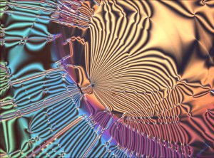 Légende : Texture de défaut dans un film suspendu de cristal liquide constitué d’une phase lamellaire de type « smectique-C » (les molécules en forme de bâtonnet sont inclinées dans les couches constituant cette phase lamellaire). L’objectif est de comprendre le rôle des défauts topologiques dans la stabilisation des films suspendus de cristaux liquides.